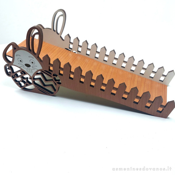 • Lovelis velykinių margučių ridenimui. Dekoruotas lazeriu pjautu zuikučiu su kiaušiniais.