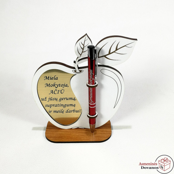 • Obuolys, padėka su graviruotu tekstu ir rašikliu, mokytojui ir ne tik.